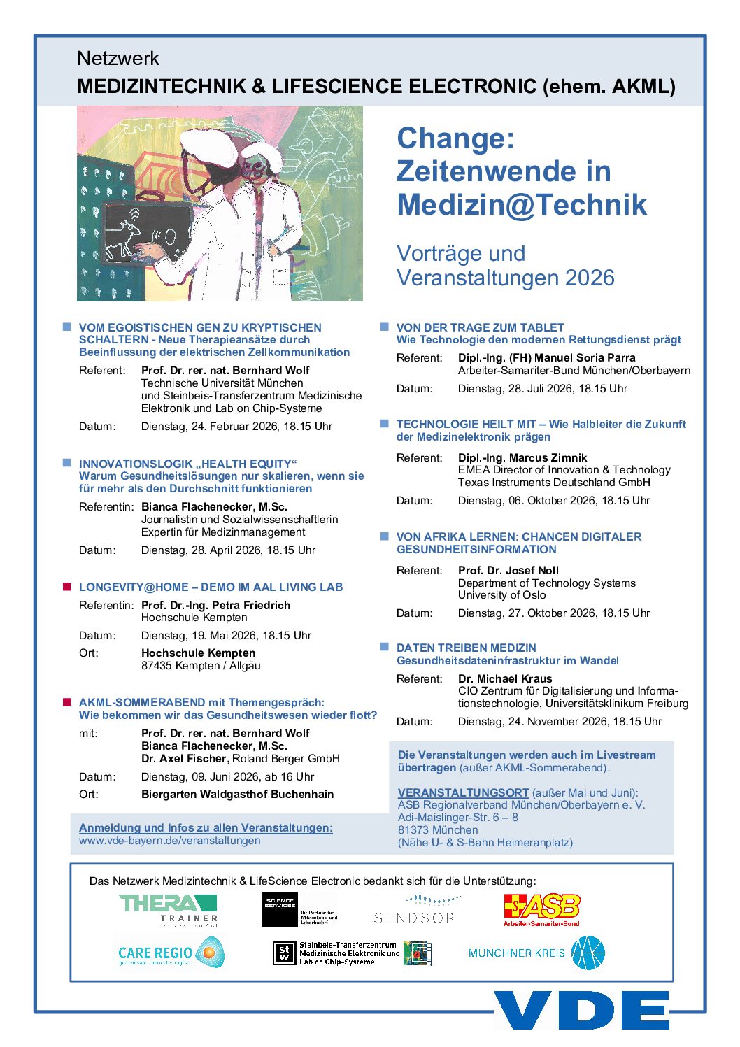 In unserem Jahresprogramm 2026 wollen wir uns anschauen, wie die Situation in den Leitdisziplinen Gesundheit und Technik aussieht, welche Risiken bestehen und welche Synergien entstehen können. Alle wissen und spüren, dass sich etwas ändern muss; die große Herausforderung wird sein, sozialverträglich neue Strukturen zu entwickeln und neue Wege zu gehen. Hierzu will das Netzwerk seinen Beitrag leisten und freut sich auf Ihre rege Teilnahme.